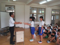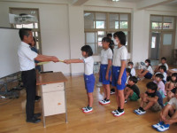 今日の集会の時間に、夏休み中に行われた東温市水泳記録会の表彰を行いました。
